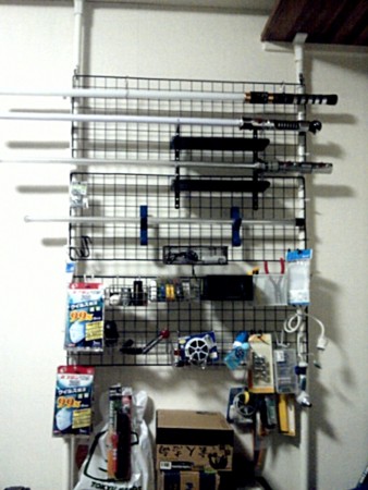 壁掛けワイヤーネットに網を一枚追加。Sカン一つと引っ掛けるカゴを3つほど、それと6角レンチとヒートシュリンク用ライターをダイソーで購入。100円ショップだから1000円でお釣りが来る。